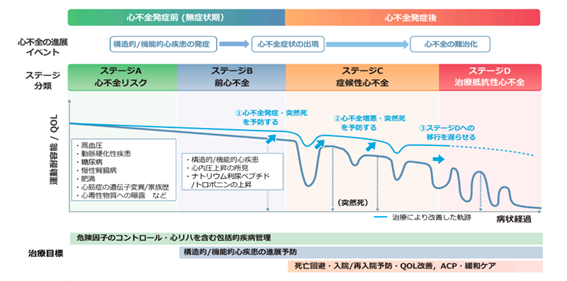 日本循環器学会,日本心不全学会.2025年改訂版心不全診療ガイドライン.P20. 図2 心不全ステージの治療目標と病の軌跡, https://www.j-circ.or.jp/cms/wp-content/uploads/2025/03/JCS2025_Kato.pdf 2026年1月閲覧